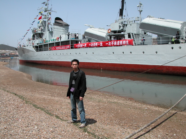 到達“老虎灘”後,我們找到了一個屋苑小區的地下停車場停車,由於早上沒吃過東西,感覺有點餓,我們找到附近的一家羊小菜館吃飯,點過羊雜湯,炒羊肝,羊肉水餃和東北烤羊肉串,除非你是喜歡或可以接受吃羊肉,否則這類菜館絕對不適合香港人的口味,尤其是炒羊肝和羊雜湯,味道極之“羶”,當然不“羶”的就不是羊肉,羊肉沒有“羶”的味道就失去了吃羊肉的真正意義。吃飽後我們步行到老虎灘廣場,老虎灘是以海水浴場聞名國內,其名字起源是由於這裡三面環山,一面靠海,而海水中的巨石形狀有如臥虎,所以稱之為老虎灘。整個老虎灘是由公園,廣場和海洋生物展覽館組成。沿途我們看見了一艘停泊在老虎灘海灣的解放軍戰艦104艦,這艘戰艦是大陸首艘導彈驅逐艦,現在已經退役並向公眾開放。