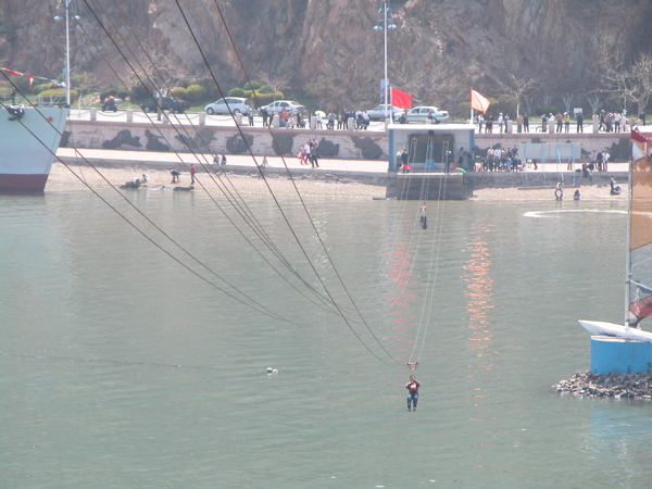 這裡其實有點象香港的海洋公園,當然規模就沒有海洋公園那麼大,而且大部分遊戲和展覽館都要另外收錢。其實我和韓勇對主題公園內這些機動遊戲興趣不大,唯一一個令我們產生興趣的遊戲是從公園最高處的一條連接到104戰艦附近的跨海索道,人就是被綁上這條索道然後以高速滑下去,整個過程才40多秒就要收50元,我和韓勇研究過後覺得還是不值,最後還是不玩了!隨便在公園內遊盪一下,參觀完珊瑚館後,我們總算結束了老虎灘的活動。下一緝的遊記我將介紹驅車前往秀月峰景區,白雲山景區和余下在大連的見聞。