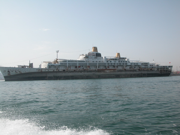 離開銀沙灘景區後,我們再沿濱海路往星海廣場進發,沿途我們經過了“大連貝殼博物館”,博物館建築就象一座古堡一樣,雖然我們沒有進去參觀,但還是把車停下來在館外拍照。公路上另外一個吸引了我和韓勇的視線就是擱淺在星海灣的一艘破郵輪,我決定要去看看,於是我們在星海廣場找到一個地方把車停下來,然後朝那搜破郵輪的方向走。星海廣場是大連新開發的景區,很大很有氣派,這裡有一個遊樂場,內有各式各樣的機動遊戲,不過這些都不是我和韓勇重點想看的,終於我們走到了這艘破郵輪的旁邊,韓勇認得出這艘郵輪是“奧麗安娜-ORIANA”號,韓勇說這艘郵輪原來是由杭州人經營,1998年拖進上海黃埔江作為娛樂中心,當這艘郵輪還坐落在上海的時侯他也登上過一次,他說還記得以前登船的門票就好像要一百多元,郵輪裡面裝修華麗,有好幾個餐廳酒吧和娛樂場所,不過2000年的時候因為經營不善而要被迫結業,郵輪後來也被拖離上海。
