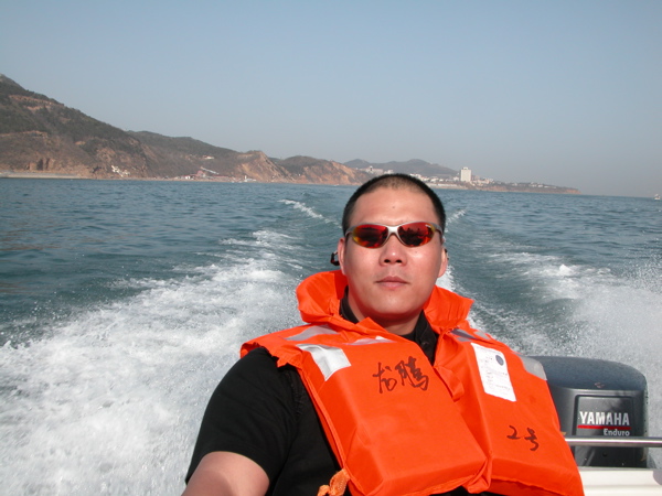 韓勇說他也沒想到原來郵輪被拖到這裡來,就我們所注意到,“奧麗安娜”號在星海廣場這裡應該也有經營開放給遊人參觀,不過售票處沒有開門,似乎已經沒有經營過好一段時間。我們在售票處的旁邊看到可以坐快艇在海岸風景區“遊船河”,於是決定上去坐一坐,門票每位40元,快艇售票員說“奧麗安娜”號去年被台風吹歪了,半邊船身浸在水中差不多一年,也是剛剛才扶正,不過這艘船過幾天就會拖走了,但準備拖到那裡就不清楚了,他說我們還算來的及,否則遲幾天後就再看不到這個在星海彎的有名景點了,快艇經過“奧麗安娜”號的另一側時候可以清楚看見這艘郵輪已經被嚴重腐蝕。快艇的駕駛員開得很快,在金沙灘突然表演幾個急速漂移動作,我和韓勇差點被拋落水中!回到岸上,我和韓勇則走到星海廣場的中心漫步,廣場的中心地段有一個樹立的華裱,據說全國除了北京天安門前的華裱之外,就只有大連這一個了。